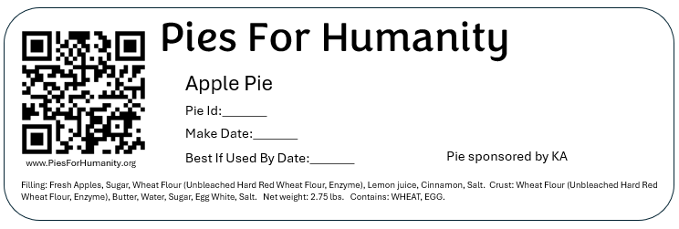 I have a plan for sufficient labor and equipment to produce the total need of Nashoba Soup Kitchen (1650 pies in 11 weeks). However, I only have commitments from family, friends, and personally to fund the ingredient costs of 400 pies. The main ingredients in decreasing cost are butter, flour, sugar, and a pie box. If you have suggestions or contact names for possible grant sources or in-kind donations, please email info@PiesForHumanity.org. Support for ingredients will be acknowledged on every pie label and on this website.